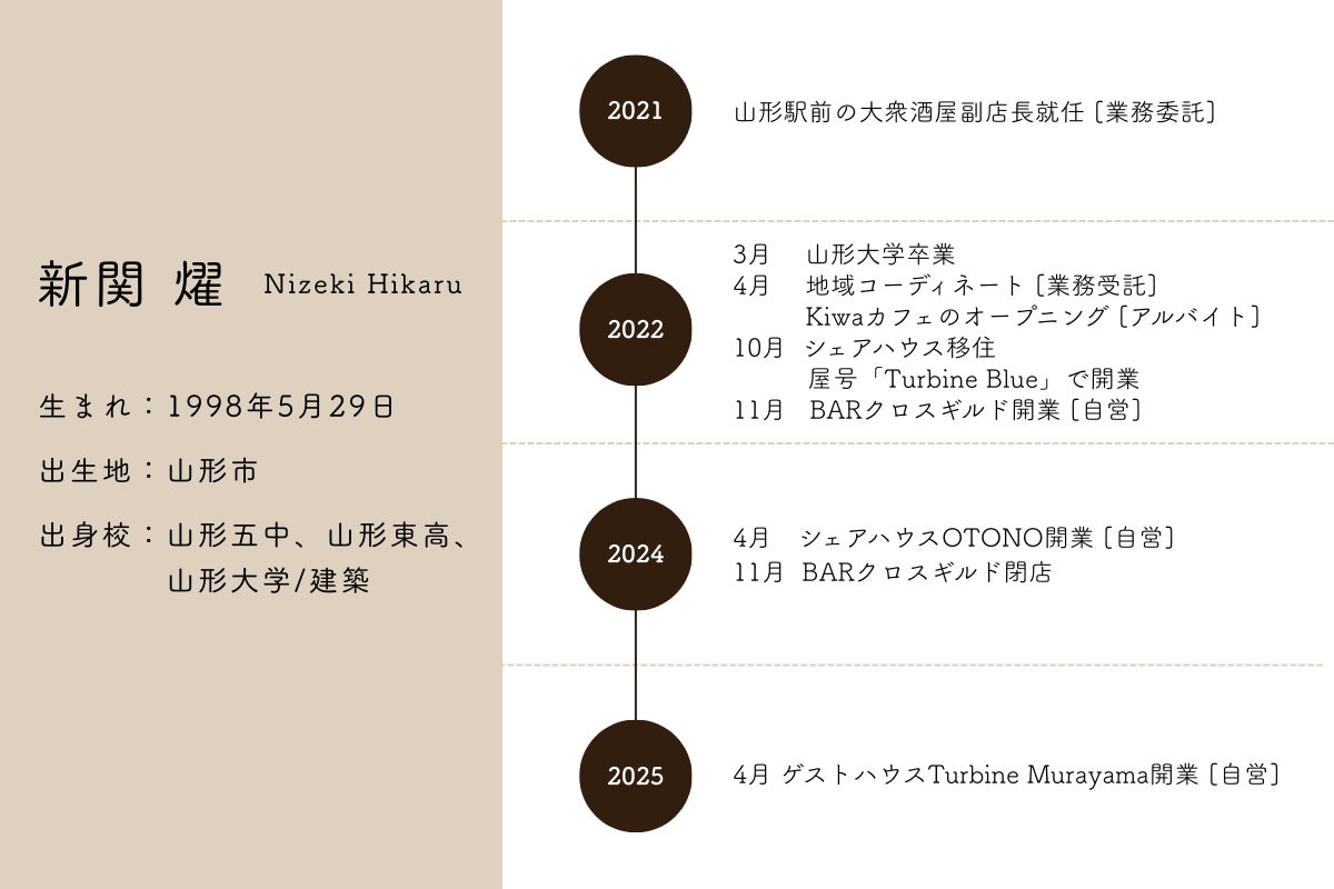 新関さんは山形大学で建築を学び、地域コーディネートや飲食店の立ち上げなど、地元に根ざした活動を積み重ねてきました。2022年には屋号「Turbine Blue」を立ち上げ、シェアハウスやバーの運営を経て、現在はゲストハウス『Turbine Murayama』を含む3棟を展開しています。