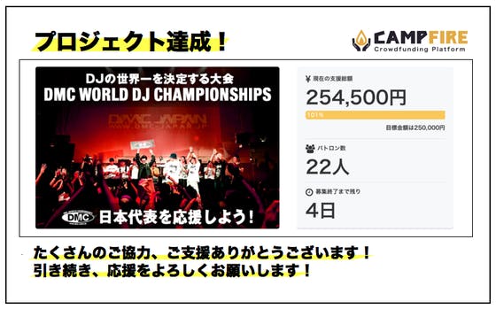 2014/08/18 12:27こんにちは。 目標金額を上回り、プロジェクトを終了することができました。 パトロンの皆様、ありがとうございます! 追ってご連絡を差し上げますので、今しばらくお待ち下さい。 また、DMC JAPAN DJ CHAMPIONSHIP 2014 FINAL supported by KANGOLは今週土曜日、渋谷WOMBにて開催されます。日本一のDJが決定する瞬間を是非見に来て下さい! 会場HP : http://www.womb.co.jp また、どうしても来れない方は決勝大会の様子を生配信するので、そちらで視聴頂けると嬉しいです。 詳しくは下記URL、DMC JAPANのHPよりご確認ください。 http://dmc-japan.jp/news/dommune-1.html 取り急ぎ、ご報告まで。 重ね重ね、パトロンの皆様、本当にありがとうございました! もっと見る