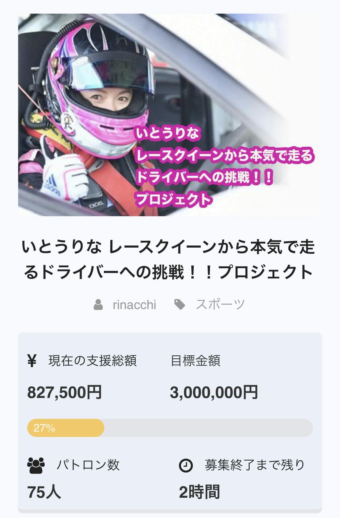 2019/03/01 00:09クラウドファンディング終了となりました。短い時間でしたが、皆様の応援とご支援のおかげで、目標の1/3達成できました。本当に、ありがとうございます。本当の目標には届きませんでしたが、ご支援していただいた資金で、少しでも活動の場が増えるように、そして結果を出せるように、モータースポーツ活動資金として使わせていただきます。もちろん、リターン品も5月ごろを目安にお送りさせていただきますので、少しお時間がかかりますが、到着までお待ちくださいませ。本当にたくさんのご支援ありがとうございました。いとうりな もっと見る