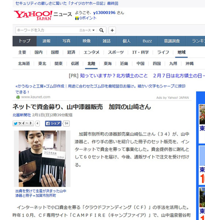 2015/02/04 16:34こんにちは、コンコントです。 先週末に石川県の地方紙である北國新聞さんが、CAMPFIREでの「つくり手の想いを伝える汁椀」プロジェクト成功についての取材に来られました。 そして、2月1日の北國新聞朝刊にてこのように載せて頂きました!紙面にこれだけ大きく載せて頂くだけでもありがたいですが、今回は北國新聞さんの配信でヤフーニュースにも載せて頂きました! (画像クリックでヤフーニュースサイトに行きます!) 伝統工芸の新しい取り組みとしてクラウドファンディングももっと広まるといいですね。 もっと見る