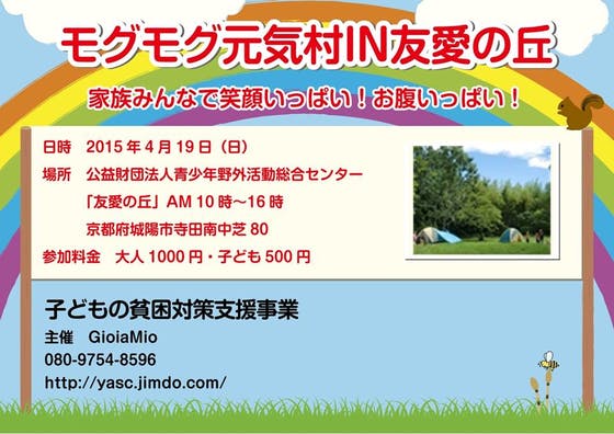 2015/04/06 17:47モグモグ元気村IN友愛の丘~おなかいっぱいになってほしい~日時 2015年4月19日(日)場所 公益財団法人青少年野外活動総合センター「友愛の丘」 京都府城陽市寺田南中芝80 電話 0774-53-3566 FAX 0774-53-8224主催 GioiaMio[モグモグ元気村プロジェクトチーム]参加料金 大人1000円・子ども500円定員 48名時間 10:00~16:00(内容)1・みんなでつくろう!わいわいクッキング!おにぎりとお味噌汁etcをみんなで作り、子ども達の『自己の発見と成長』を目的に子ども達が中心となり取り組む2・みんなで楽しもう!子ども探検隊!友愛の丘の自然を探検し春を感じ、子ども達の「自主性を養う」(持ち物)軍手、汚れた時の着替え、おにぎりの具材、水筒※当日は現地集合でお願いします。迎えが必要な方は送迎します。JR奈良線長池駅下車徒歩15分から20分ーーーーーーーーーーーーーーーーーーーーーーーーーーーーーーお問い合わせ GioiaMio 090-9754-8596(伊達)http://yasc.jimdo.com/ もっと見る