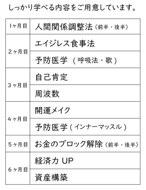 内面の磨き(周波数・自己肯定・人間関係調整法・お金のブロック解除)外面の美(開運メイク・エイジレス食事法・予防医学)経済力up、など、女性が元気に生きていくための「全て」を揃えます。総合大学みたいなイメージです。ここですべてが揃うような、女神を創る学校です。