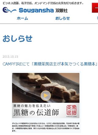 2015/10/19 11:08「朱郷慶彦×双眼社 インタラクティブ出版プロジェクト」に引き続き、クラウドファンディングプラットフォーム「CAMPFIRE」にて「沖縄純黒糖真の伝道師を目指す!神奈川県茅ヶ崎市・黒糖茶房店主が本気でつくる黒糖本」プロジェクトを公開いたしました。 神奈川県茅ヶ崎市にある和cafe「黒糖茶房」の店主・大森健司氏と双眼社のコラボである本プロジェクト。 CAMPFIREのプロジェクトページでは、「とにかく、一人でも多くの人に黒糖の魅力を伝えたい!」という思いを余すことなくお伝えしています。ぜひプロジェクトページをご覧くださいね。 支援期間は、2015年12月4日まで。みなさまの温かいご支援お待ちしております! もっと見る