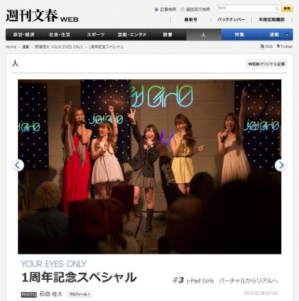 2013/03/07 16:22週刊文春WEBに掲載されました! 1周年記念スペシャル #3 j-Pad Girls バーチャルからリアルへ 萩庭桂太 YOUR EYES ONLY - 週刊文春WEB http://shukan.bunshun.jp/articles/-/2435 もっと見る