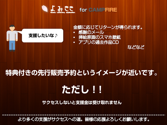 2012/08/29 18:56● 仕組みがわかりにくい ● 何が起こるのかわからない ● 支援してのに、後から課金されると通知が来たけど? などを頂きました。 全体的な支援を求めた動機などは、ネイバーまとめなどで記載を させていただきましたが、 こちらよりご覧になれます ネイバーまとめ 仕組みとしては、500円から20万円までの範囲で、制作にかかる費用の 一部を興味のある方より支援を頂きたいという趣旨の元、 このCAMPFIREさんで提供いただいているクレジットカード決済で、 支援をするとその見返りとして特典を差し上げますという流れです。 また、目標金額が残念ながら未達に終わった場合は、いただいた支援は 全て返金されます。 つまり、決済の猶予期間が30日ある作品やイベントなどの予約購入など と趣旨が近いかもしれません。 わたしとしてもより多くの支援を頂けると幸いですが、未達でも作品は制作 していきますのでご安心を。 ただ、制作期間が延びてしまう事はご容赦ください。 わたしとしても、一刻も早く、より多くの人に作品を届ける事ができるように iPhone版なども鋭意制作中ですので、ご支援のほど、何卒よろしくお願 いします。 もっと見る
