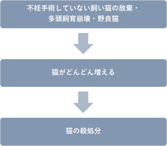 現在、不妊手術していない飼い猫を放棄したり、家の中で不妊手術していない猫を飼い始めて育てきれない数に増えてしまったり(多頭飼育崩壊)と、人が猫を最後までお世話できないことで起こる問題が多くあります。