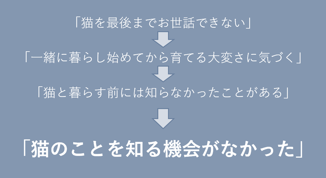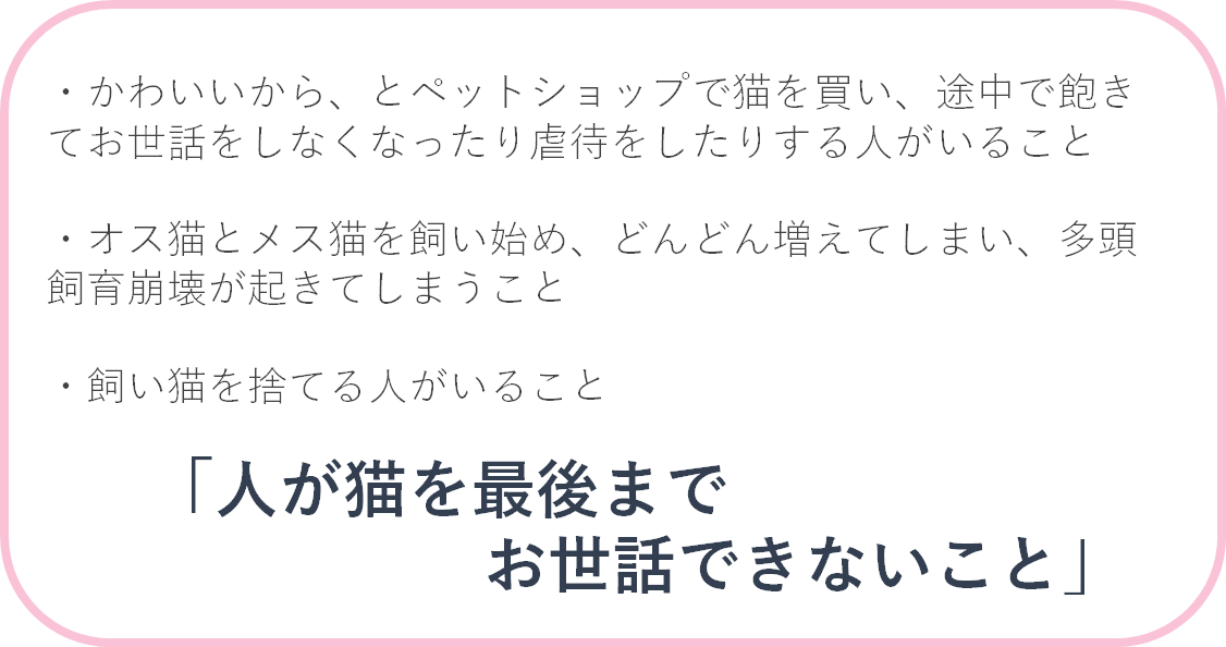 そこで、なぜ「人が猫を最後までお世話できないことで起こる問題」が生み出されてしまうのかを考えてみました。