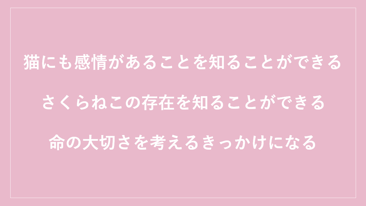 この絵本の中には、さくらねこも登場するので、子供たちはストーリーを通してさくらねこの存在を知ることができます。