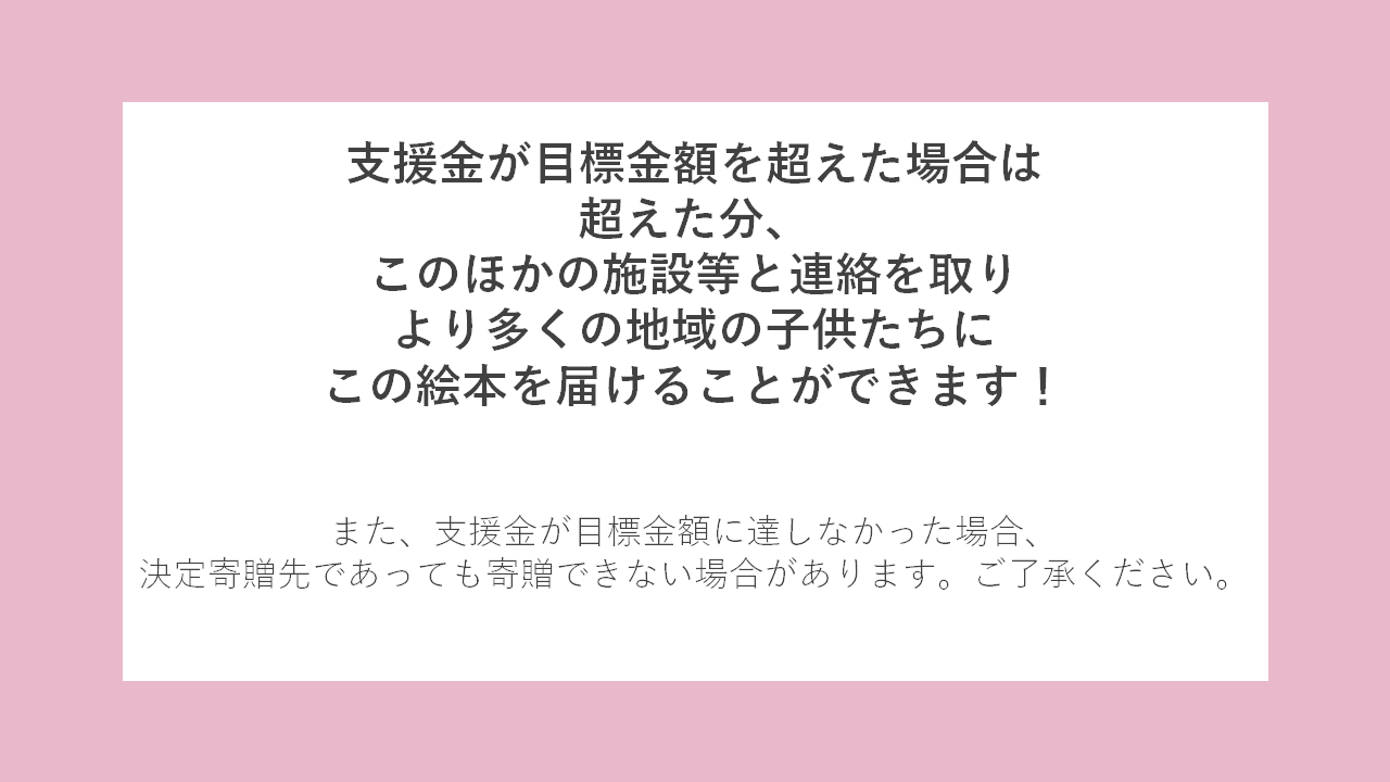 支援金が目標金額を超えた場合は、超えた分、より多くの子供たちにこの絵本を届けます!