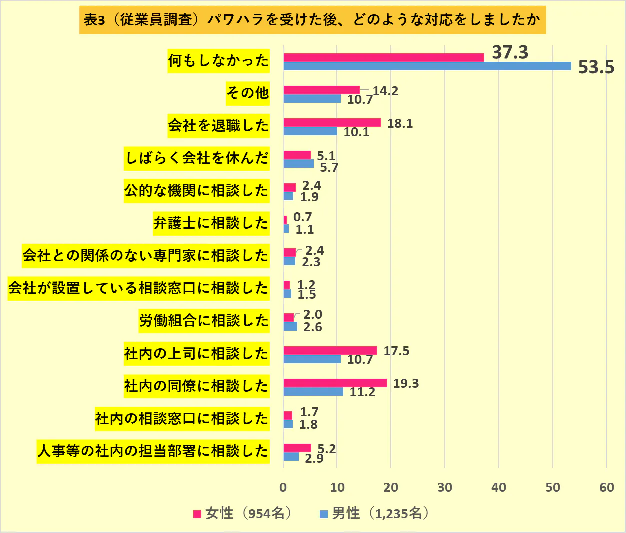 厚労省のハラスメント調査でも、約4割の人がパワハラやセクハラの被害を受けた後も、「何もしなかった」と回答しています。その理由として、「何をしても解決にならないと思ったから」や「職務上不利益になると思ったから」の割合が高くなっています。