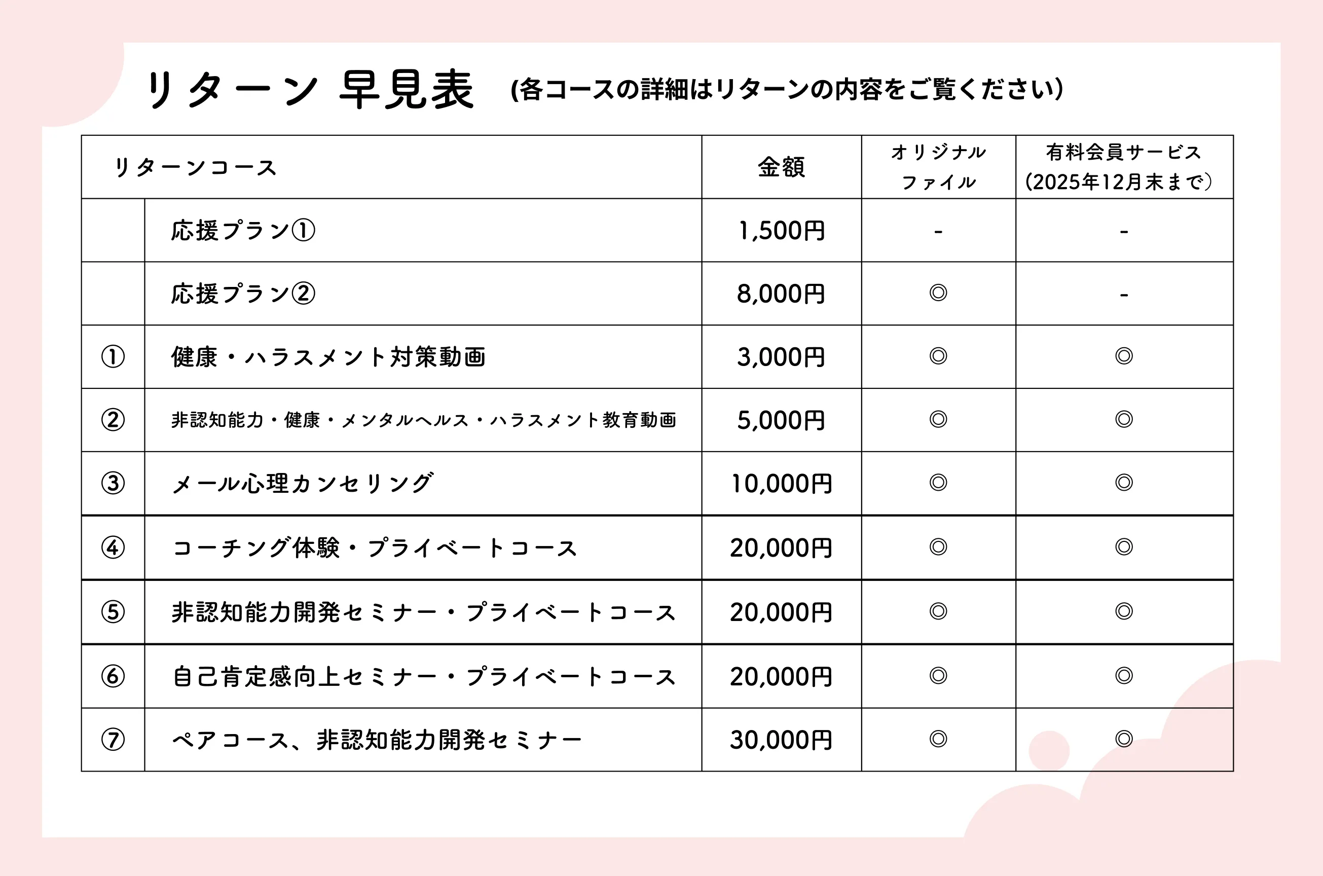無料会員のサービスに加え、AIによるチャットでのハラスメント・労働問題の相談、チャットまたはメールでの専門家への相談、非認知能力開発(自己肯定感・自己承認・レジリエンス他)の無料セミナー、コーチング無料体験、等のサービスを提供します。本格的な研修・コーチングをご希望の方には、割引クーポンを差し上げます。AI機能を活用して、AIによる自己肯定感向上のアプリ利用、ストハラ♡研究所研究員アイにゃんの「メッセージ、占い、癒し画像」等のサービスも充実していく予定です。(会員規約、プライバシーポリシー)
