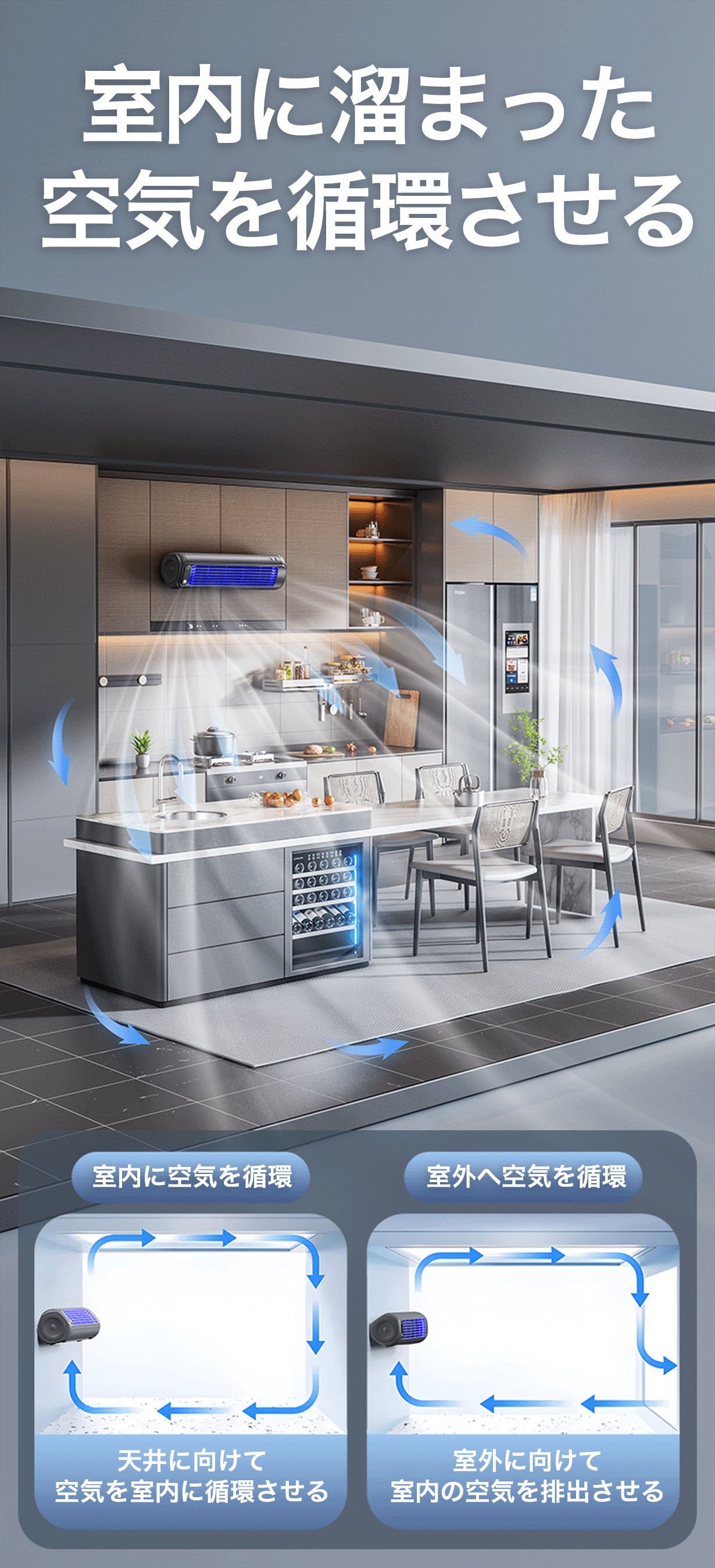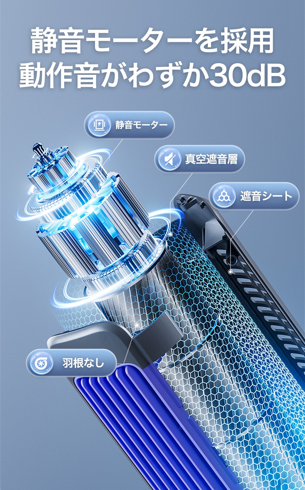 本製品は羽根なしタイプなので、より強力な風を生み出し、使用者により一層の涼しさを感じさせます。