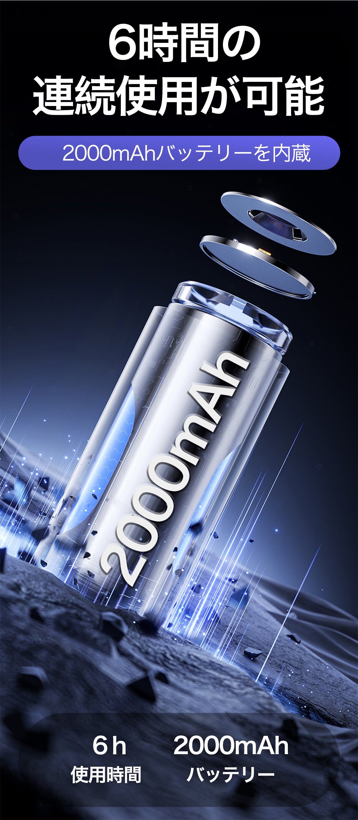 2000mAhの大容量内蔵バッテリーを搭載しており、最大6時間の連続使用が可能です(送風弱モード)。長時間の使用が必要なアウトドア活動にも安心してご利用いただけます。