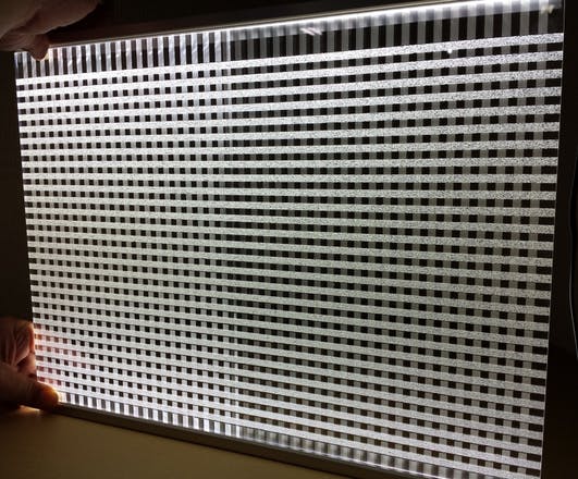 このエッジライト導光板は、バックライト部品として多くの用途に使われていますが、今回、透明板厚内部に反射用の加工痕を形成配列するという、世界初の導光板の開発に成功しました! 用途に応じてこの新しい導光板を使用した製品も創っていく計画です。