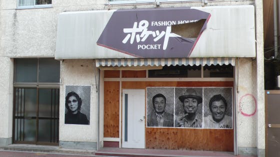商店街での展示です。この建物のオーナーの高橋さんは初め恥ずかしがって中々撮影されなかったのですが、他の人を誘ってもくれ始めました。