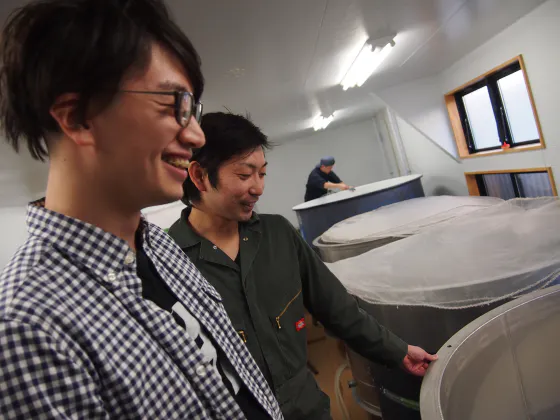 (写真はタンクの中を見る僕と渡辺社長)