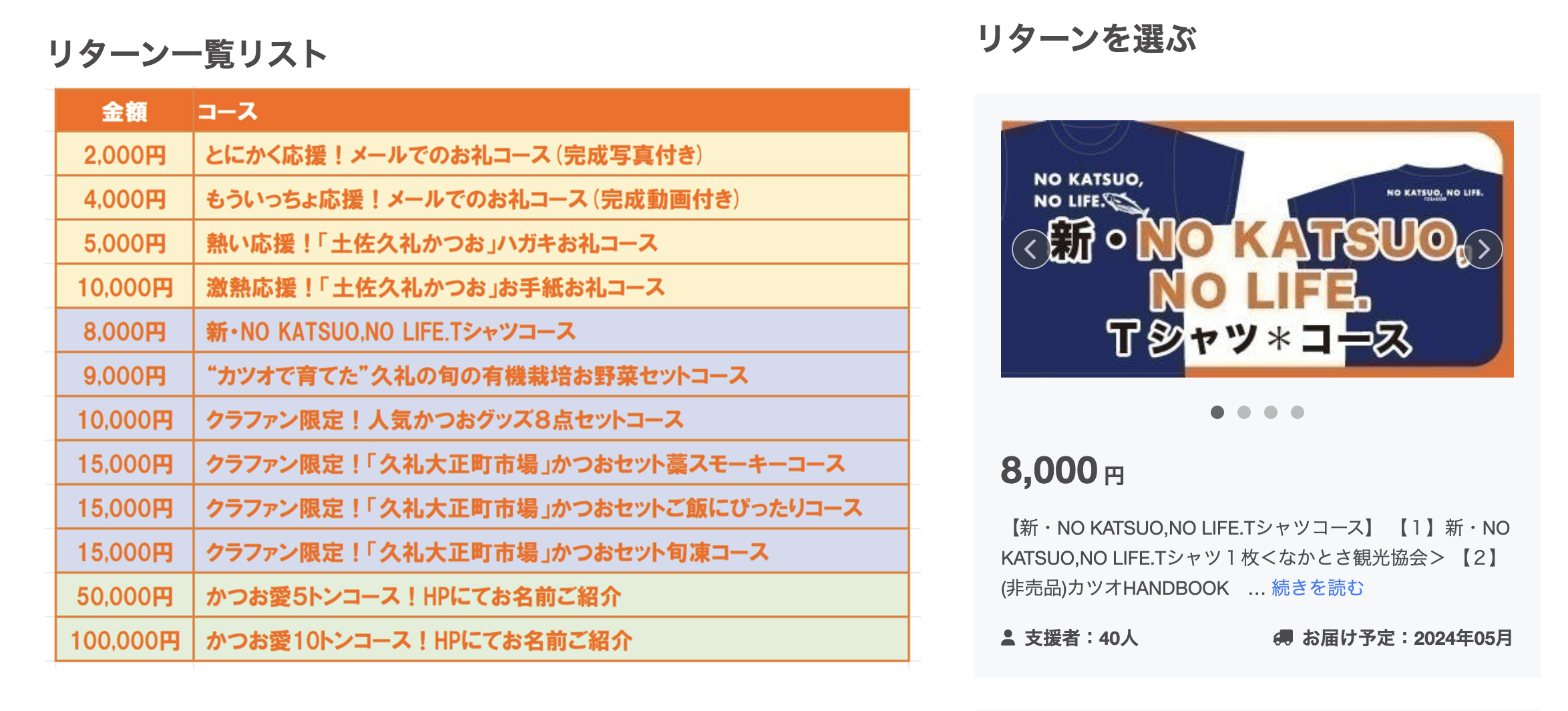 すべてのリターンを「カツオに全振り」で構成。地域の事業者さんに一つひとつ声をかけて調整していくのは大変でした。人気の「NO KATSUO, NO LIFE.」Tシャツは、中土佐町で以前から使われていたデザインをベースに、新バージョンとして観光協会がタイミングを合わせて作ったもの。自分もずっとユニフォーム代わりに着ていました。