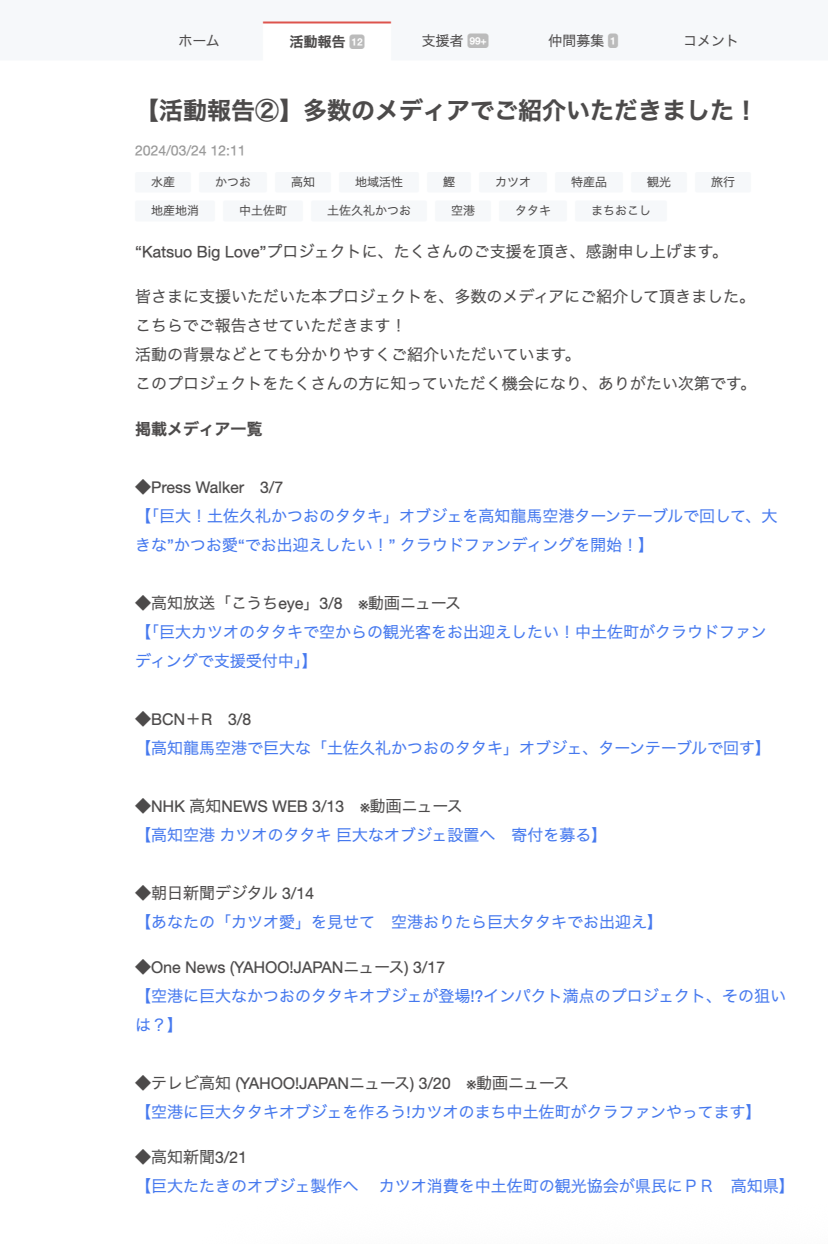 準備期間はだいたい3ヶ月ぐらいでしたね。とにかく時間がなかったというのが実感でした。空港への交渉、50倍のカツオオブジェの制作、リターンの用意、お披露目会の準備、ページの作成等。オブジェは、お金が集まらないと作れないのでその算段をつけたり、やることが本当に多かったんです。