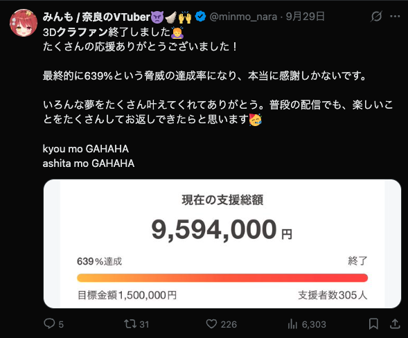 また、「みんもが夢を叶える姿を見るのが自分の夢だった」と言ってくださる方や、「3Dになったみんもと一緒にイベントに参加したい」と未来の楽しみを共有してくださる方もいて…。単なる金銭的な支援以上に、皆さんの「一緒に成長していきたい」という思いを感じられたことが、何よりの支えになりました。