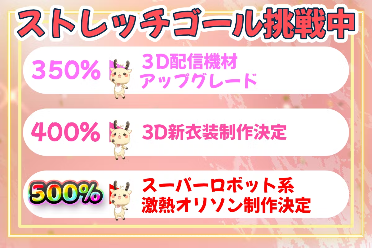 そこで設定したのが350%達成でおうち3D機材のバージョンアップ、400%達成で3D新衣装制作、そして500%達成でスーパーロボット系の激熱オリジナルソング制作というストレッチゴールです。正直、500%なんて夢のような数字だと思っていたんですが…まさかそれも達成してしまうとは!