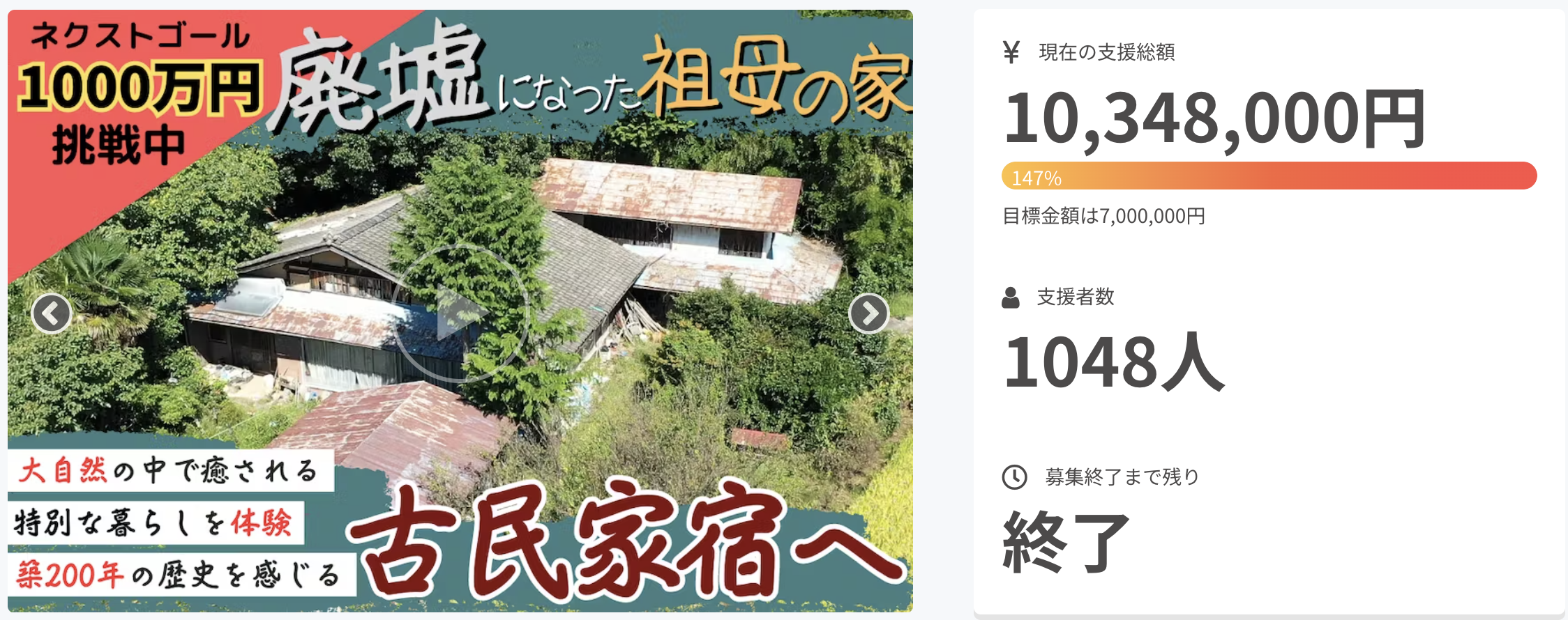 「婆ちゃんの生まれ育った家をなんとか綺麗にしてあげたい」孫4人によるYouTubeが人気で、復興活動の様子を見守るファンが目標金額達成を自分ごとのように喜び、期待と応援が集まりました。現況や今後の計画について丁寧に報告し、誠意もしっかり伝わるプロジェクトです。ずっと見てきたから、自分事のように嬉しい