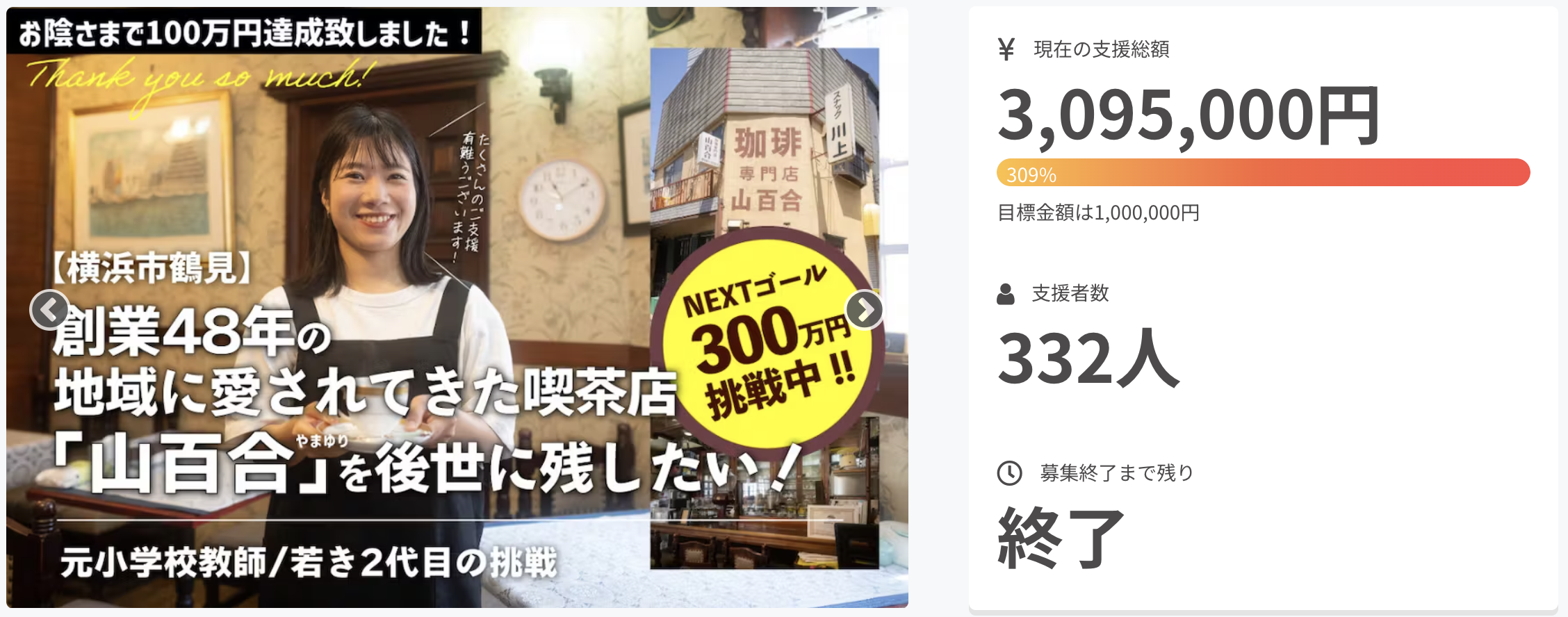 喫茶店文化を残したいと第三者承継により若き女性店主が店舗回収を目的にプロジェクトを実施。支援者を意識したプロジェクトページの作り、クラウドファンディングのために作成した動画など、プロジェクトらしさがページからも滲み出ています。賛同したデザイナーが作成したステッカーをリターンにするなど仲間を作りながら、喫茶文化を残す活動を広げました。Instagram、Twitterを中心SNSでの発信も積極的に行ったこと、また最終日の時点でネクストゴールにまだ到達していなかった状況から最後の最後インスタライブの配信等もして、最後の最後にネクストゴールも達成。金額は大規模というわけではありませんが、プロジェクト内容も目的もCAMPFIREらしい、CAMPFIREを象徴するようなプロジェクトだと思います。想いを丁寧に伝え続ける
