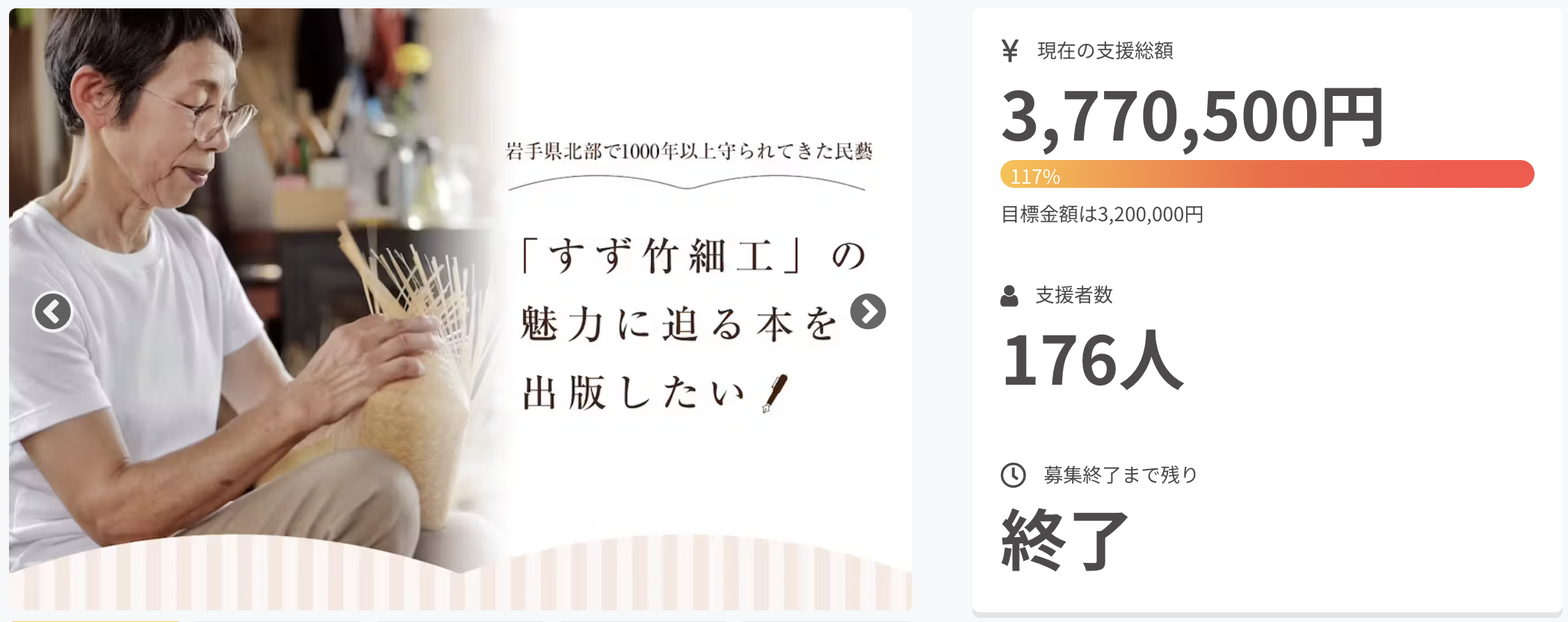 プロジェクト名: かごを編む 鳥越のすず竹細工と共に・柴田恵 プロジェクトURL: https://camp-fire.jp/projects/view/694165 募集期間:2023年10月02日~2023年11月30日 支援総額:3,770,500円 支援者数:176人 カテゴリ:書籍・雑誌出版 プロジェクトオーナー:gallerykeian