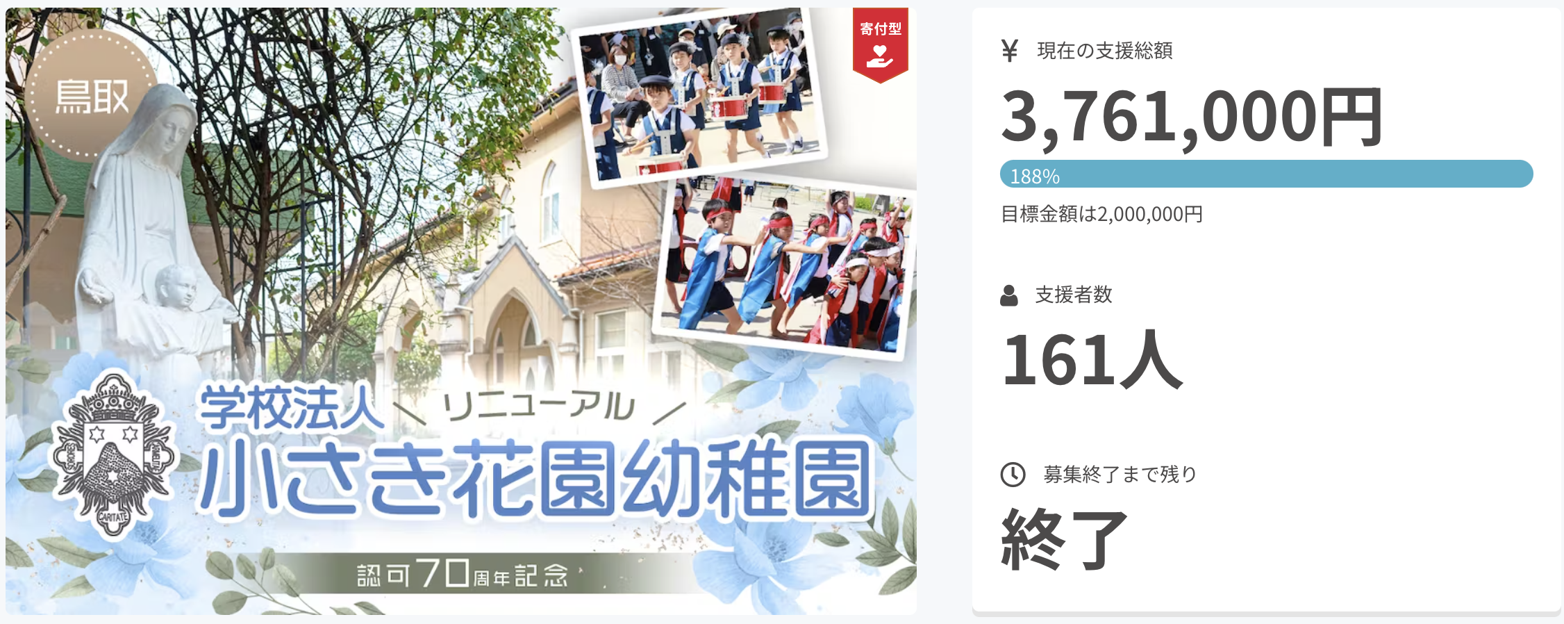 鳥取の認可70周年を迎える幼稚園のプロジェクト。キリスト教精神に基づいたカトリック系の幼稚園ということで、これまでは「あるものを大事に使う」というモットーでメンテナンスしながら備品や設備を使い続けてきていましたが、さすがに限界が来ているということで認可70周年記念で大規模リニューアルを決意。その費用の一部を寄付型クラウドファンディングで集めました。当初は「本当に集まるのかな?」とスタッフも不安を感じていたようですが、蓋を開けると過去の卒園生や保護者の方、近隣にお住まいの方から、多額の寄付支援が次々と集まって、スタッフ一同大感激をしたそうです。特に「応援コメント」などで届く応援の声がスタッフの励みにもなったようで、クラウドファンディングを通じて過去から未来へ「想い」が巡った好事例です。大切な思い出が蘇る