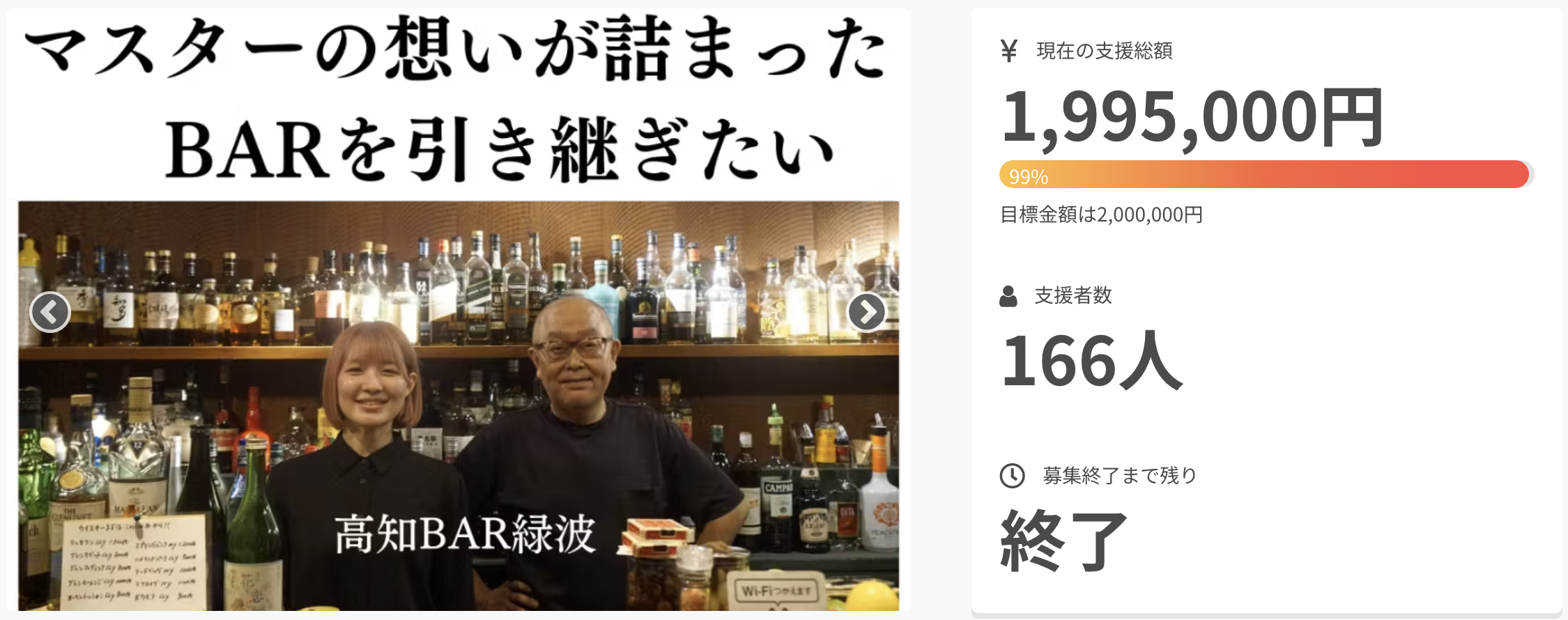 プロジェクト名: 継承 先代マスターが病気のため閉店を余儀なくされたBARを引き継ぎたい プロジェクトURL: https://camp-fire.jp/projects/view/695945 募集期間:2023年09月09日~2023年10月20日 支援総額:1,995,000円 支援者数:166人 カテゴリ:フード・飲食店 プロジェクトオーナー:roppa_kouchi