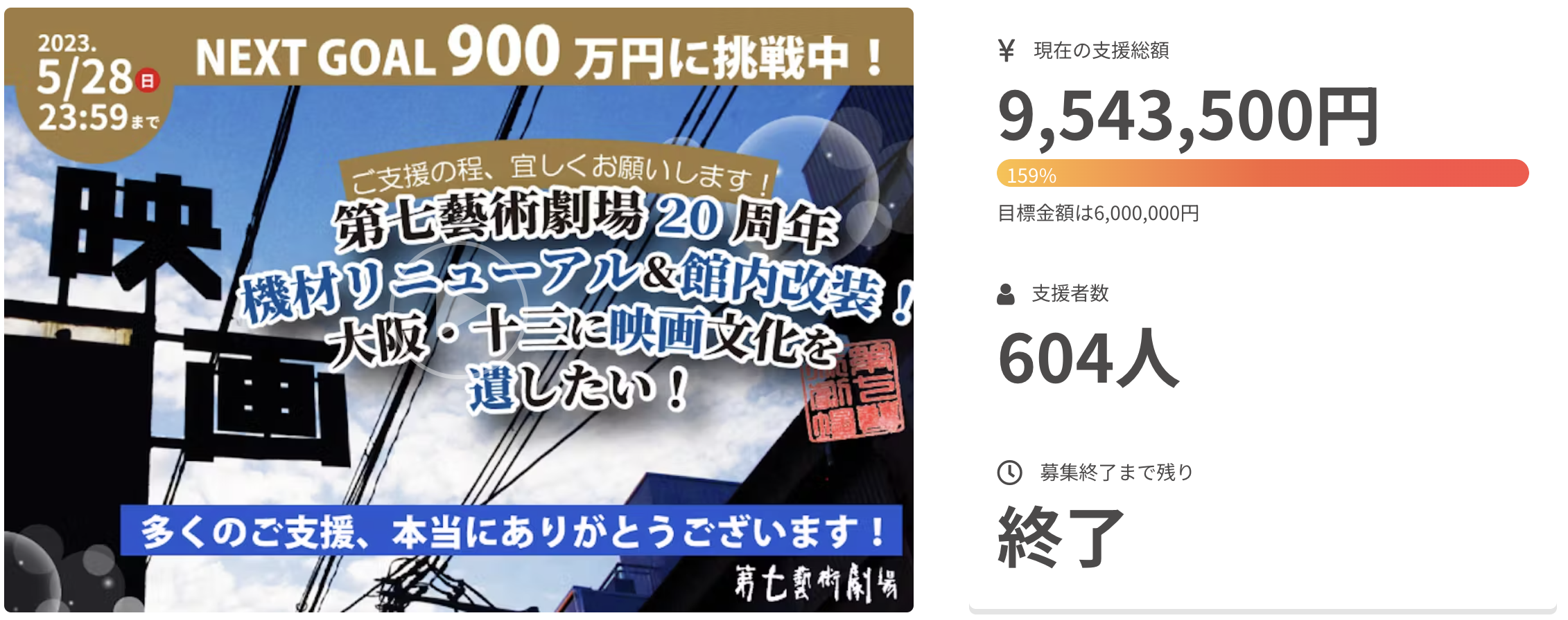 プロジェクト名: 第七藝術劇場 20周年、機材リニューアル!大阪・十三に映画文化を遺したい! プロジェクトURL: https://camp-fire.jp/projects/view/658008 募集期間:2023年04月15日~2023年05月28日 支援総額:9,543,500円 支援者数:604人 カテゴリ:映像・映画 プロジェクトオーナー:nanagei