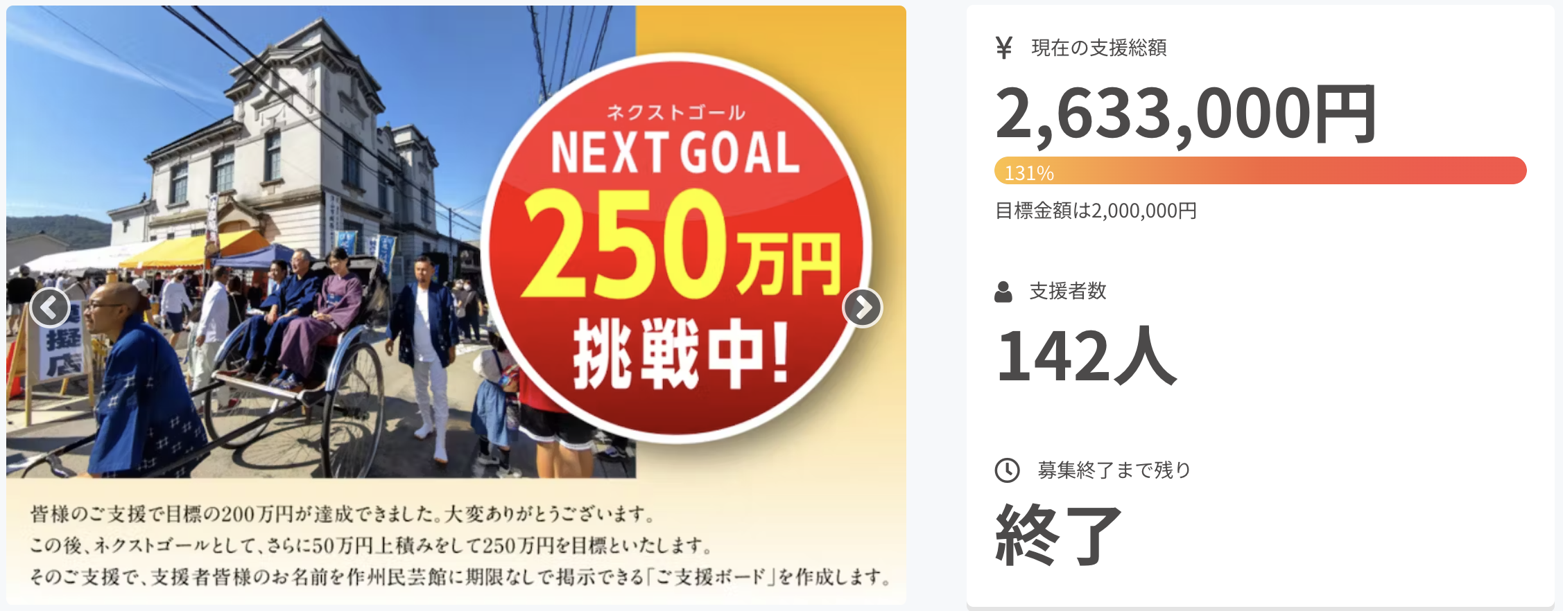 ほぼ地元の方への地道な説明会の開催で支援目標を達成したプロジェクト。地元のおじいちゃんおばあちゃんが、若者が何か頑張ってる、という目線で支援に繋がっているらしく、まさに挑戦の火を地元みんなで支えようとする図がクラファンのあるべき姿そのもので、素晴らしいと思いました。地道な説明会で仲間集め