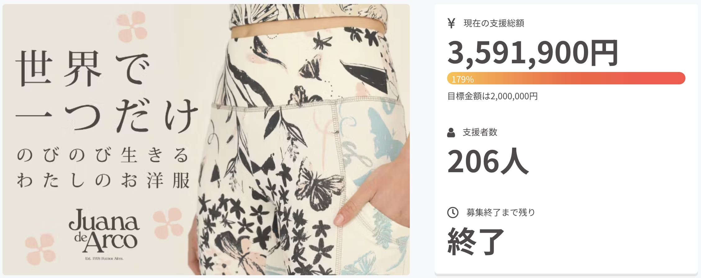 プロジェクト名: 【Juana de Arco復活へ】内側から輝く、1点もののウェアと共に歩もう。 プロジェクトURL: https://camp-fire.jp/projects/view/694717 募集期間:2023年09月08日~2023年09月30日 支援総額:3,591,900円 支援者数:206人 カテゴリ:ファッション プロジェクトオーナー:Airi Shirane