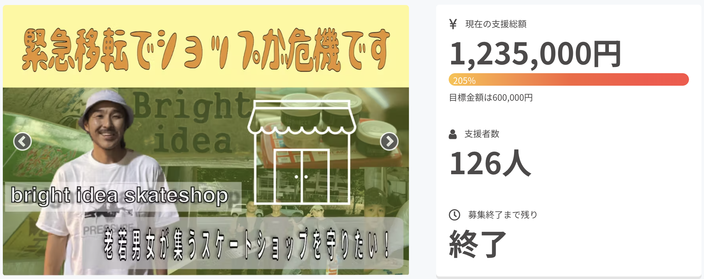 昨今、使用できるスペースの制限などが設けられているなど、自由に走ることが日本ではまだ難しいスケートボードですが、スケートボードを使用可能な公園を市に掛け合って創立に尽力するなど、地域と文化の結びつきに貢献されてきたオーナー様によるプロジェクト。オーナー様が経営するスケートボードショップの移転プロジェクトでしたが、達成率200%という数字を見ても周りからの愛情と、スケートボードカルチャーへの情熱を強く感じました。大切な"居場所"を守ってほしい