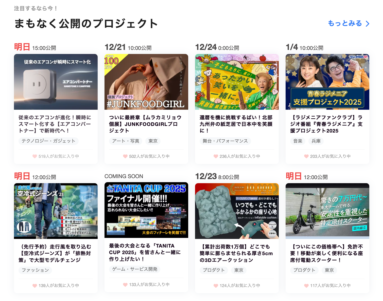 公開前に、CAMPFIREページ内の「まもなく公開のプロジェクト」に無料で掲載することが可能です。