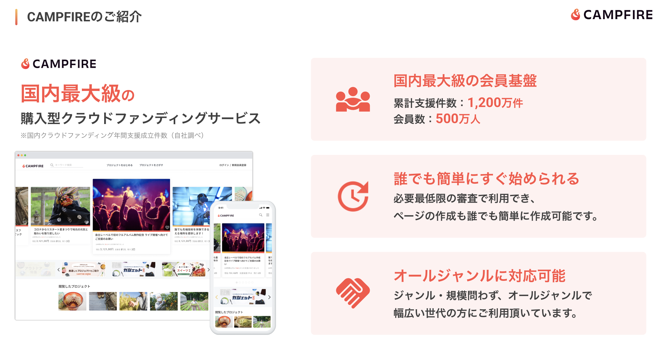クラウドファンディングは「アイデアを形にしたい」プロジェクトオーナーと、「その夢を応援したい」支援者をマッチングさせるサービス。CAMPFIREは累計10万件のプロジェクトを成功に導いてきた、国内最大級のプラットフォームです。