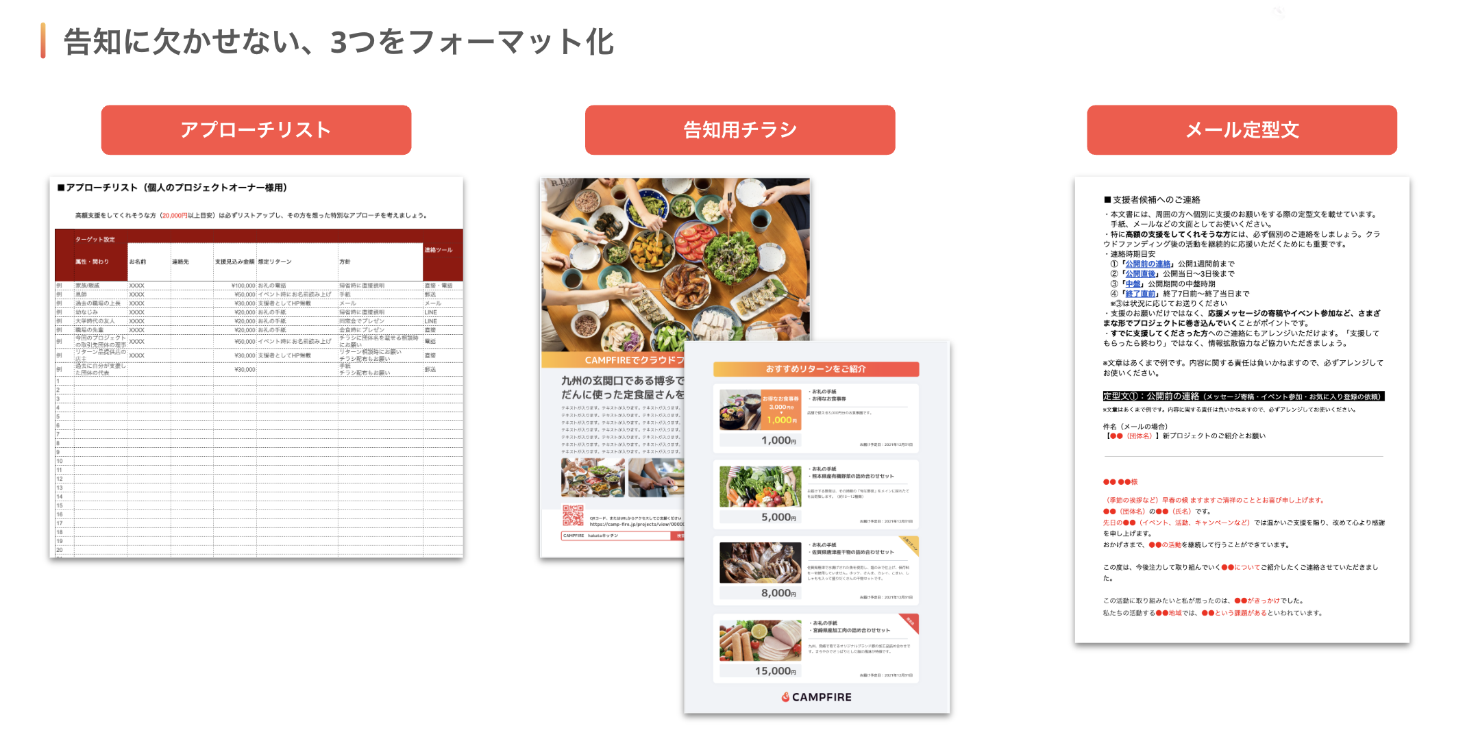 👉 お忙しい方は、まずはこの3つをチェック! 【1】「アプローチリスト」を制作しよう (P19) ▶️ アプローチリストをダウンロードする(個人・法人団体用/Excel ver) 【2】「告知用チラシ」を作成しよう ▶️ チラシテンプレートをダウンロードする 【3】身近な方へ「メール・電話」で想いを伝えよう(P24) ▶️ 支援候補者へのご連絡定型文をダウンロードする(Word ver)