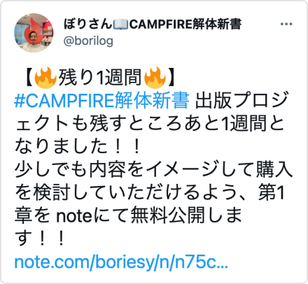 ここまでの期間でプロジェクトを知ってくれた人たちに、終了が近いことを伝え、ページに訪問してもらいましょう。❶参考になる発信事例をご紹介