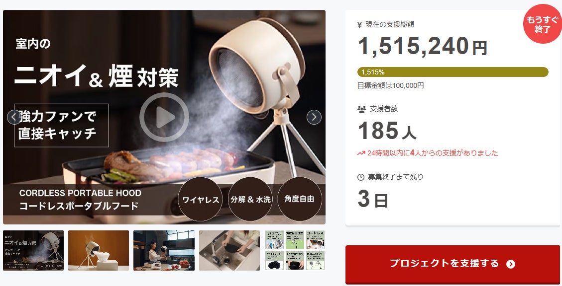 ご支援者 様、煙・油・ニオイを瞬時に強力吸収する場所を選ばないコードレス換気扇にご興味をお持ちいただきありがとうございます。お陰様で、開始から支援総額150万円達成することができました!終了までわずか 3 日となります。小洒落たサーキュレーターのような風貌ですが、中身はしっかりとしたレンジフー...