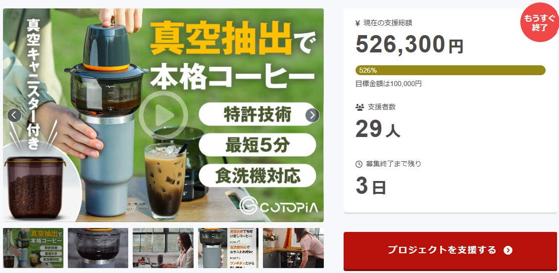 ご支援者 様、特許技術で深い味わいを最短5分で実現。真空抽出コーヒーメーカー+密封キャニスターにご興味をお持ちいただきありがとうございます。お陰様で、開始から支援総額52万円達成することができました!終了までわずか 3 日となります。時間を計ってみるとちょうど5分で下に押し出されていきました。...