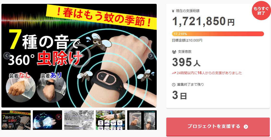 ご支援者 様、春はもう蚊の季節!赤ちゃんやペットにも使える、7種の音波で全方位虫よけバンドにご興味をお持ちいただきありがとうございます。お陰様で、開始から支援総額170万円達成することができました!終了までわずか 3 日となります。お子様や高齢者のいる家庭でも、Ultrasonic Mosqu...