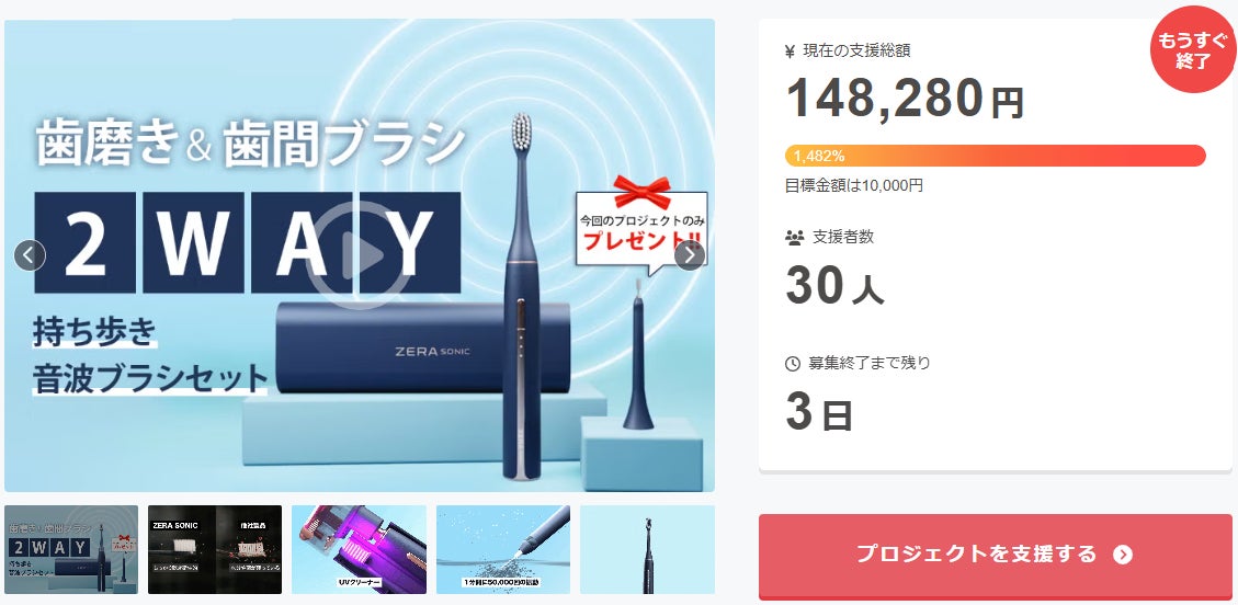 ご支援者 様、UVクリーナーとマイクロファンでいつでも新品同様衛生的!2Way音波ブラシセットにご興味をお持ちいただきありがとうございます。お陰様で、開始から支援総額14万円達成することができました!終了までわずか 3 日となります。ZERA SONIC歯ブラシは、歯ブラシと歯間ブラシを一体化...