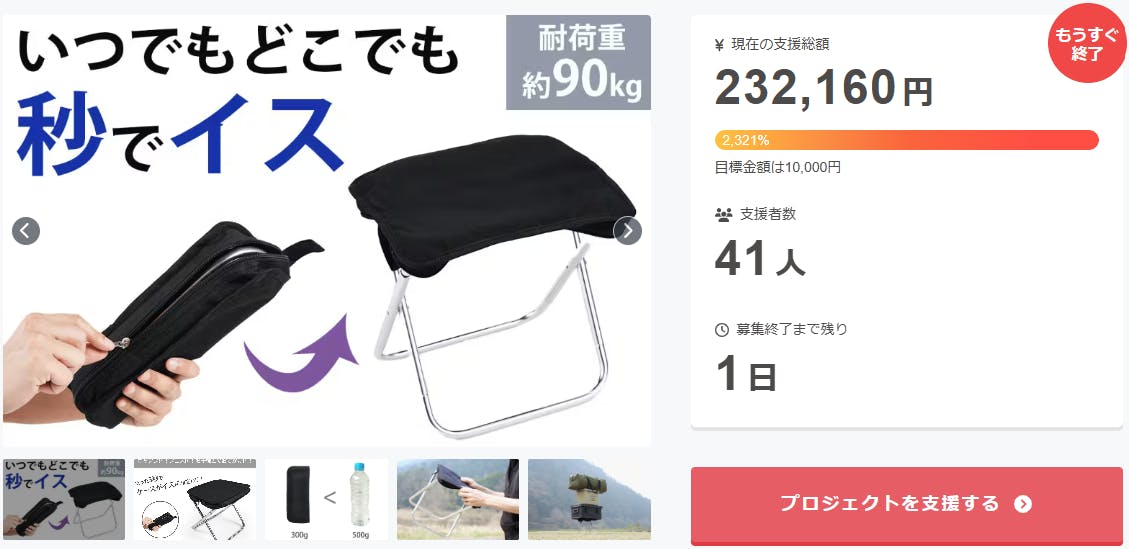 ご支援者様、バッグ型から3秒で椅子になる!持ち運びもラクラクな超コンパクト折り畳みチェアにご興味をお持ちいただきありがとうございます。お陰様で、開始から支援総額23万円達成することができました!終了までわずか 1 日となります。<組立てわずか3秒!いつでもどこでも座りたいときにすぐ座れま...