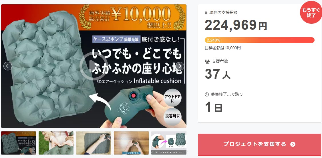 ご支援者様、【累計出荷数1万個】どこでも簡単に膨らませられる厚さ5cmの3Dエア―クッションにご興味をお持ちいただきありがとうございます。お陰様で、開始から支援総額22万円達成することができました!終了までわずか 1 日となります。<【1月31日までの支援ですぐ届く! 】屋内・屋外いつで...