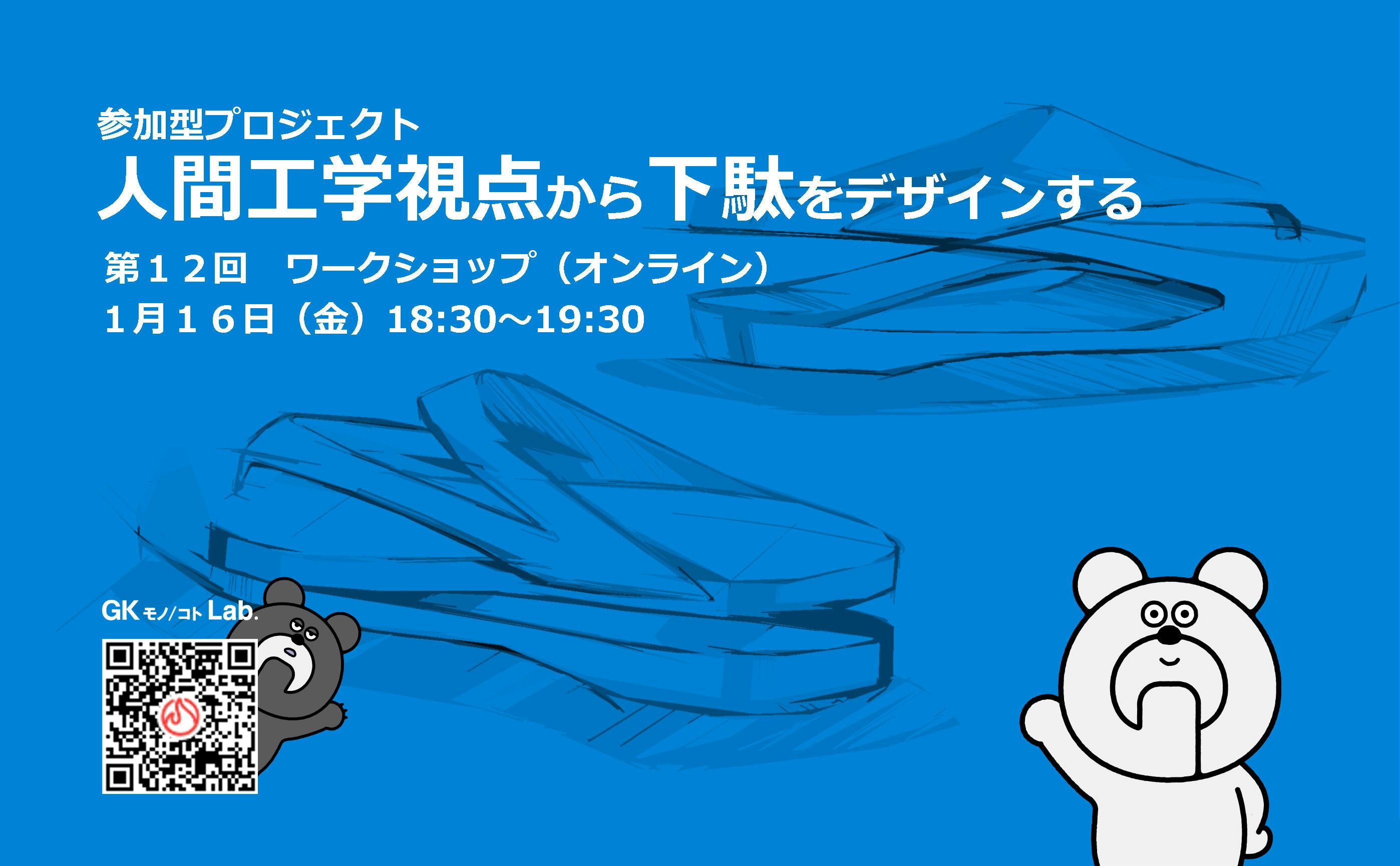 こんにちは!GKモノ/コトLab.です!「人間工学視点から下駄をデザインする」第12回オンラインワークショップのお知らせです。1月16日(金)18:30ー19:30です。ひょんなことから関係ができた下駄メーカーへ向けて、勝手に下駄を提案しちゃおうっていうプロジェクト。その第12回目オンラインワ...