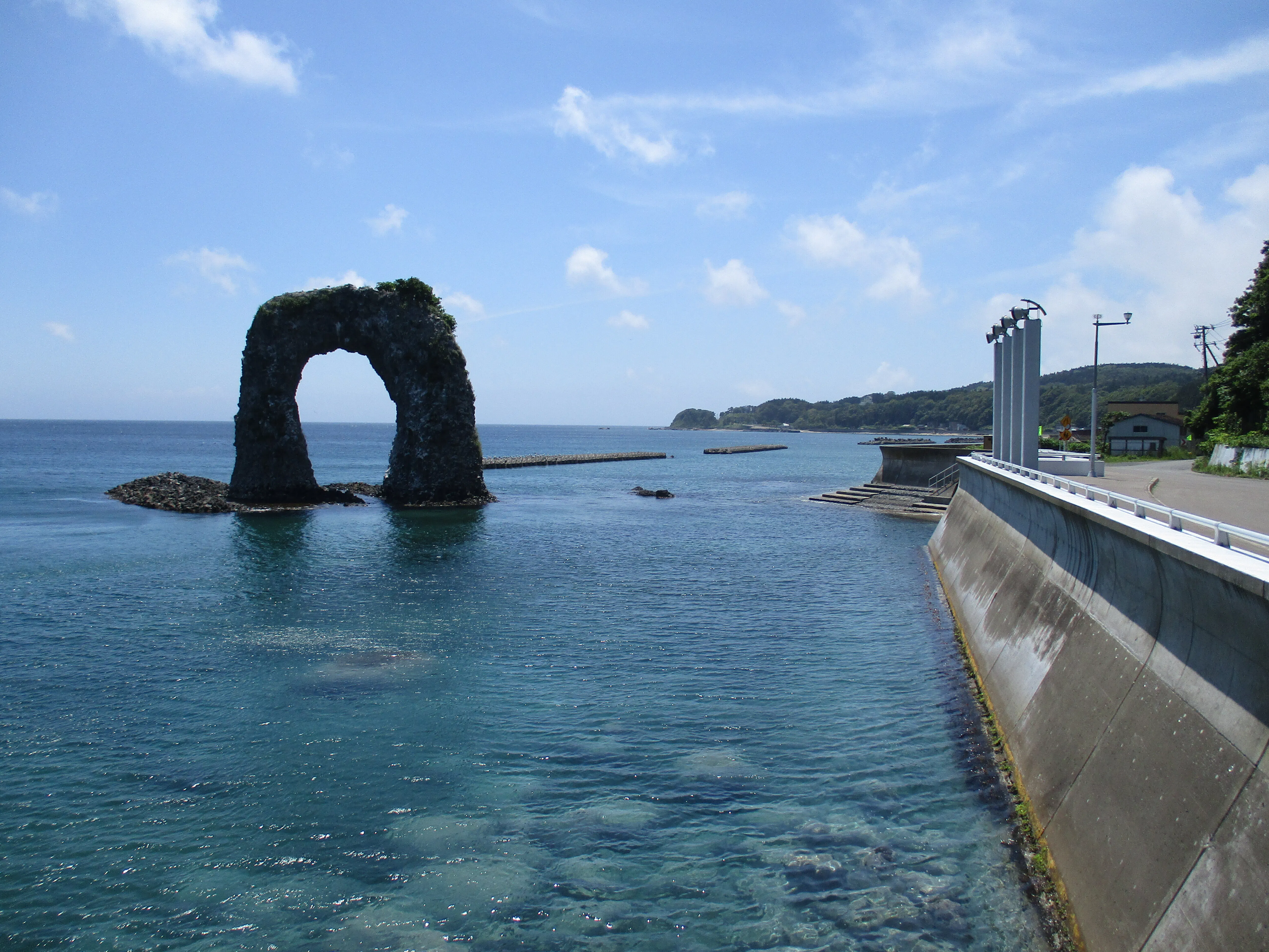 今晩は、島のシンボルのなべつる岩です、高さが19,5メートルあり岩の上に四季の花が咲きますよ。フェリー乗り場から車で5分です。夜間照明も見事です。陸からは歩いては渡れません。近くは道路工事中です。近頃転入のトラックが見えています。明上雅孝。