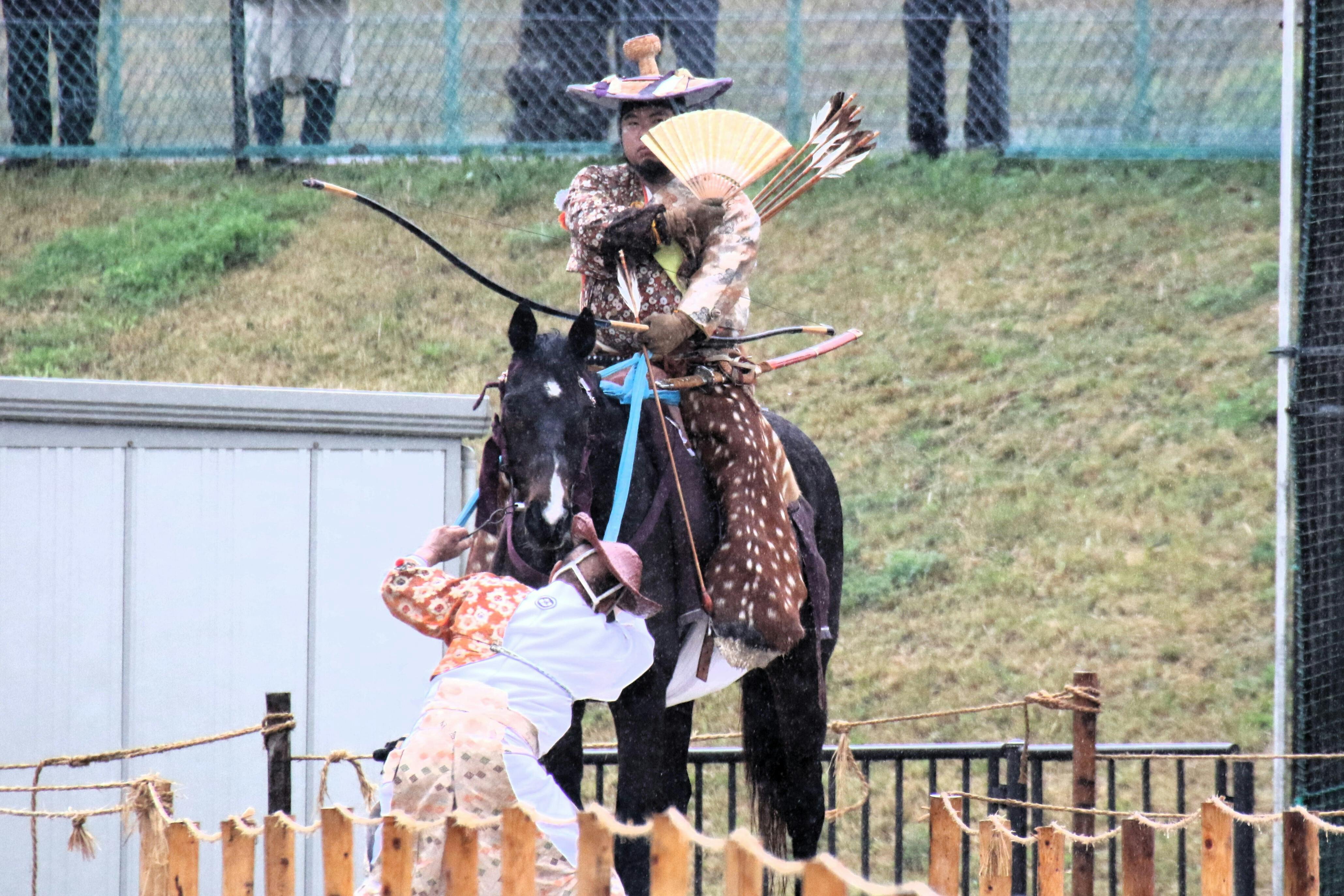 第3回流鏑馬まつりの一場面です。壱之射手による揚扇(あげおうぎ)の所作が行われています。射手はまず扇捌きを行い、その後、馬を走らせながら扇を前方へ投げ揚げ、矢を番えます。そして、そのまま壱の的へと向かいます。この揚扇は、流鏑馬の始まりを告げる大切な儀式です。神事としての流鏑馬が、ここから本格的...