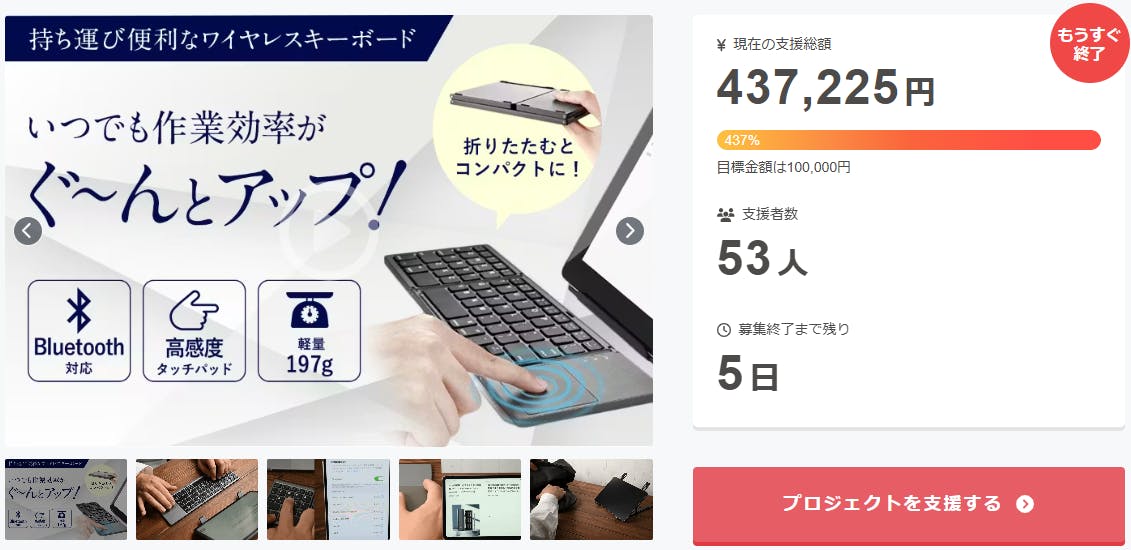 ご支援者様、197gの超軽量!折りたたみ式ワイヤレスキーボードで快適作業をにご興味をお持ちいただきありがとうございます。お陰様で、開始から支援総額43万円達成することができました!終了までわずか 5 日となります。<197gの超軽量ボディと折りたたみ式デザインで、持ち運びに便利なワイヤレ...