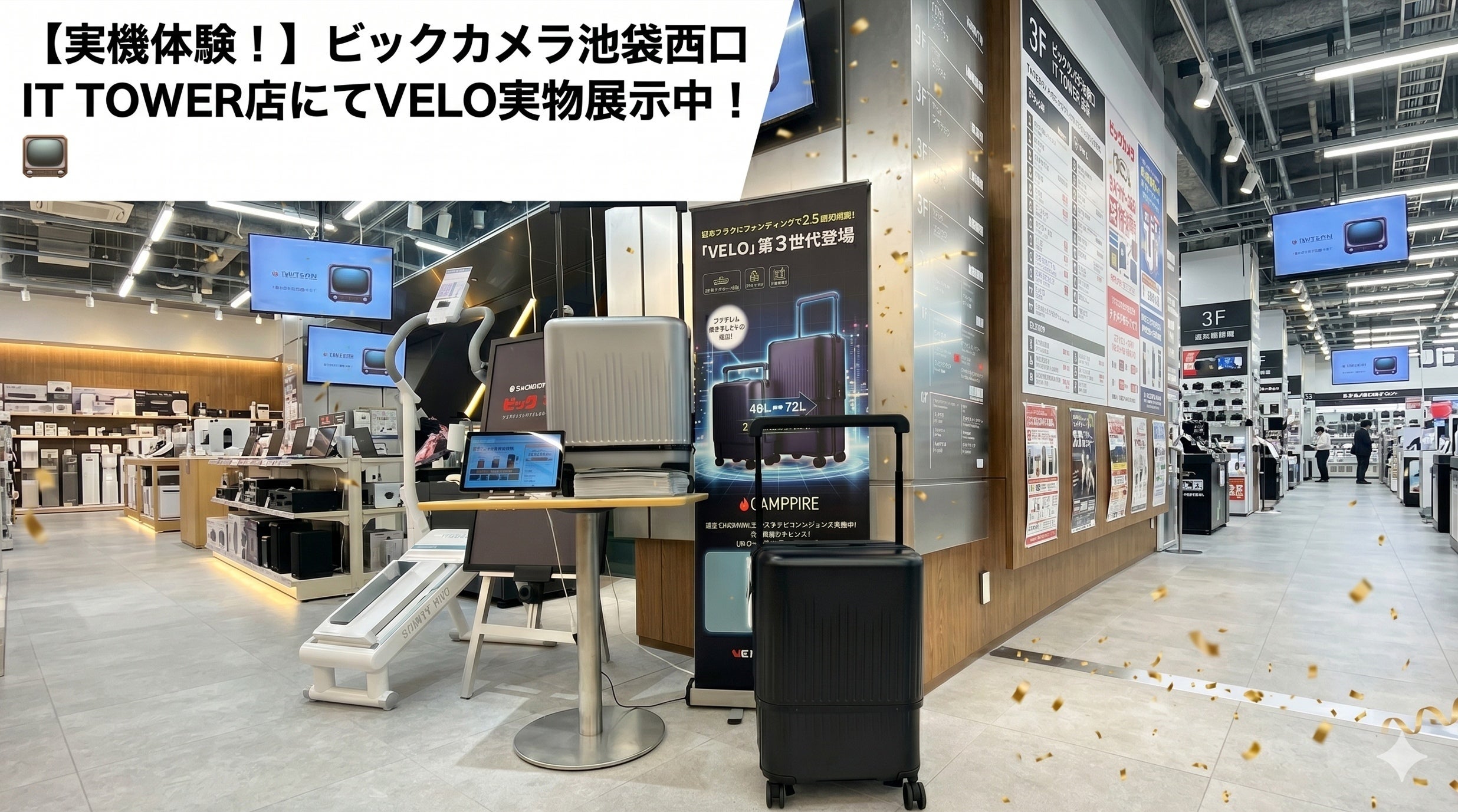 【CAMPFIREプロジェクト・現場レポート】現在、CAMPFIREで絶賛公開中の次世代3in1スーツケース**「VELO(ヴェロ)第3世代」。 「実際にサイズが変わる様子を見てみたい」「質感を確認したい」という多くのリクエストにお応えし、現在ビックカメラ池袋西口 IT TOWER店**にて実...