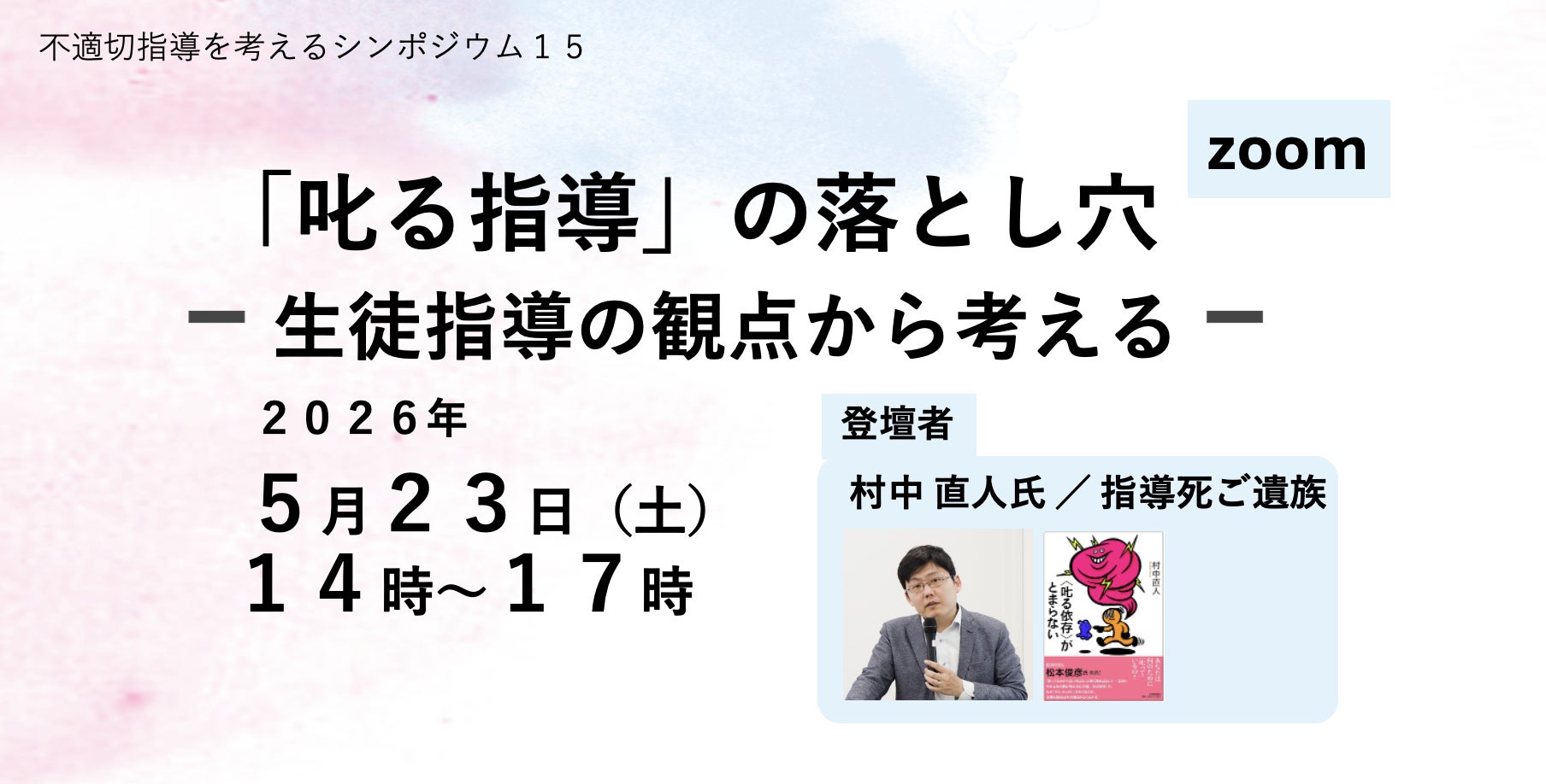 皆様、新年度をいかがお過ごしでしょうか。5月23日(土)14時〜17時で、15回目のzoomシンポジウムを行います!今回は 『〈叱る依存〉がとまらない』の著者の村中直人さんと、鹿児島市の指導死ご遺族に登壇していただきます。シンポジウムの詳細や関連情報は、こちらをご確認ください。https://...