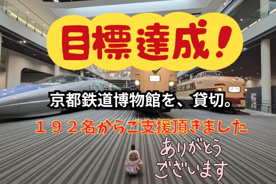 京都鉄道博物館を貸切るクラウドファンディングですが、みなさんのおかげで達成致しました。合計192名の方からのご支援を賜りまして、ありがとうございました!詳細YouTubeにアップしてますので、ぜひご覧下さい。https://youtu.be/Mowo2NwDcww?si=GaqMEYMifmu...